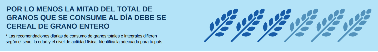 Como parte de un patrón de alimentación correcta, las Guías Alimentarias en México recomiendan que los adultos consuman 6 porciones al día aproximadamente 230 gramos al día de granos enteros.