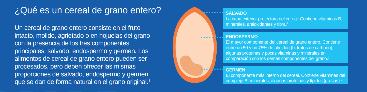 Un cereal se considera grano entero cuando se conservan las tres partes de los granos originales: El salvado, el endospermo y el germen.